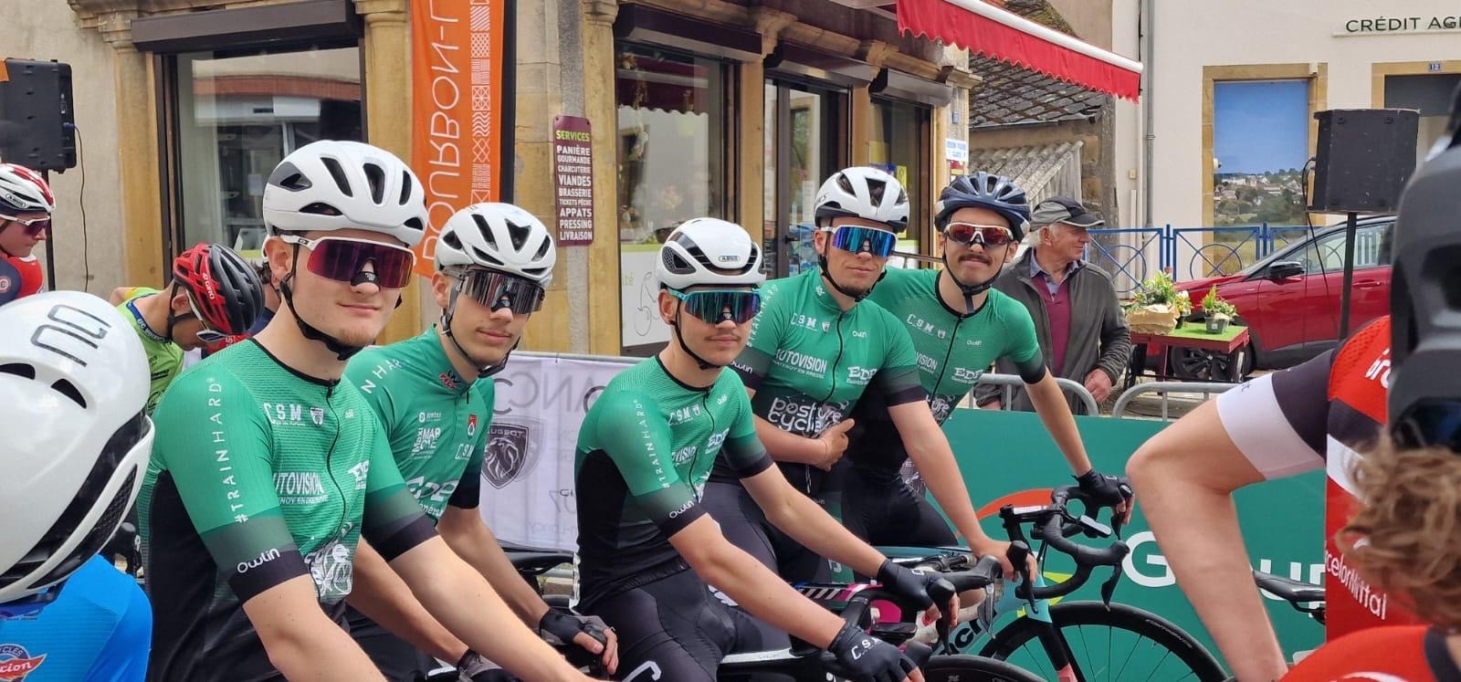 La semaine dernière, nos jeunes FFC du CSM ont pris part à la première course par étapes de l’année lors du Tour de la Communauté de Communes entre Arroux, Loire et Somme, du 25 au 27 avril. Organisation parfaite de l’EC Bourbonien avec le soleil tout le week-end pour faire découvrir cette belle course à nos jeunes. L’équipe était composée de Nathan Alenda, Enzo Rebillard, Paul Lonjaret, Sulyvan Girardeau, Mathis Cerqueira.