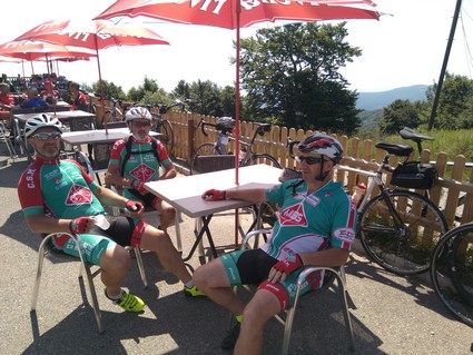 La suite sera un peu plus vallonnée et marquée par la chaleur, suffisant pour faire éclater le groupe, certains à la peine et d'autres semblant pressés d'en découdre avec la suite. En effet, celle-ci s'annonce piquante avec l'ascension du ballon d'Alsace, 10 kilomètres avec des pourcentages approchant par endroit les 8 a 10%. La montée se fait pour beaucoup esseulé, certain étant pressé d'arriver pour voir le match qui va débuter, tandis que d'autres sont résignés à monter à leur rythme. A ce jeu c'est Roger qui arrive le premier en haut suivi de Daniel et Eric tandis que les fugitifs du départ se sont égarés et sont finalement derrière, l'occasion de rappeler que "rien ne sert de courir, il faut suivre le bon chemin...". Finalement tout le monde arrivera au gite "La vieille Colonie" à St-Maurice sur Moselle pour se retrouver autour d'une bonne bière fraiche bien méritée suivi d'un repas typique Vosgien le soir, à savoir un bon boeuf bourguignon...